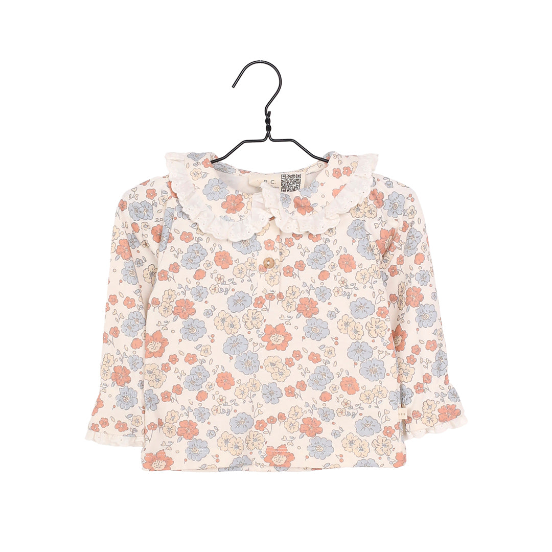 Son imprimé Bloom aux tons pastel et son col volanté bordé de broderie anglaise en font une pièce douce et poétique. Facile à enfiler, parfaite pour les journées pleines de tendresse et de jeux.