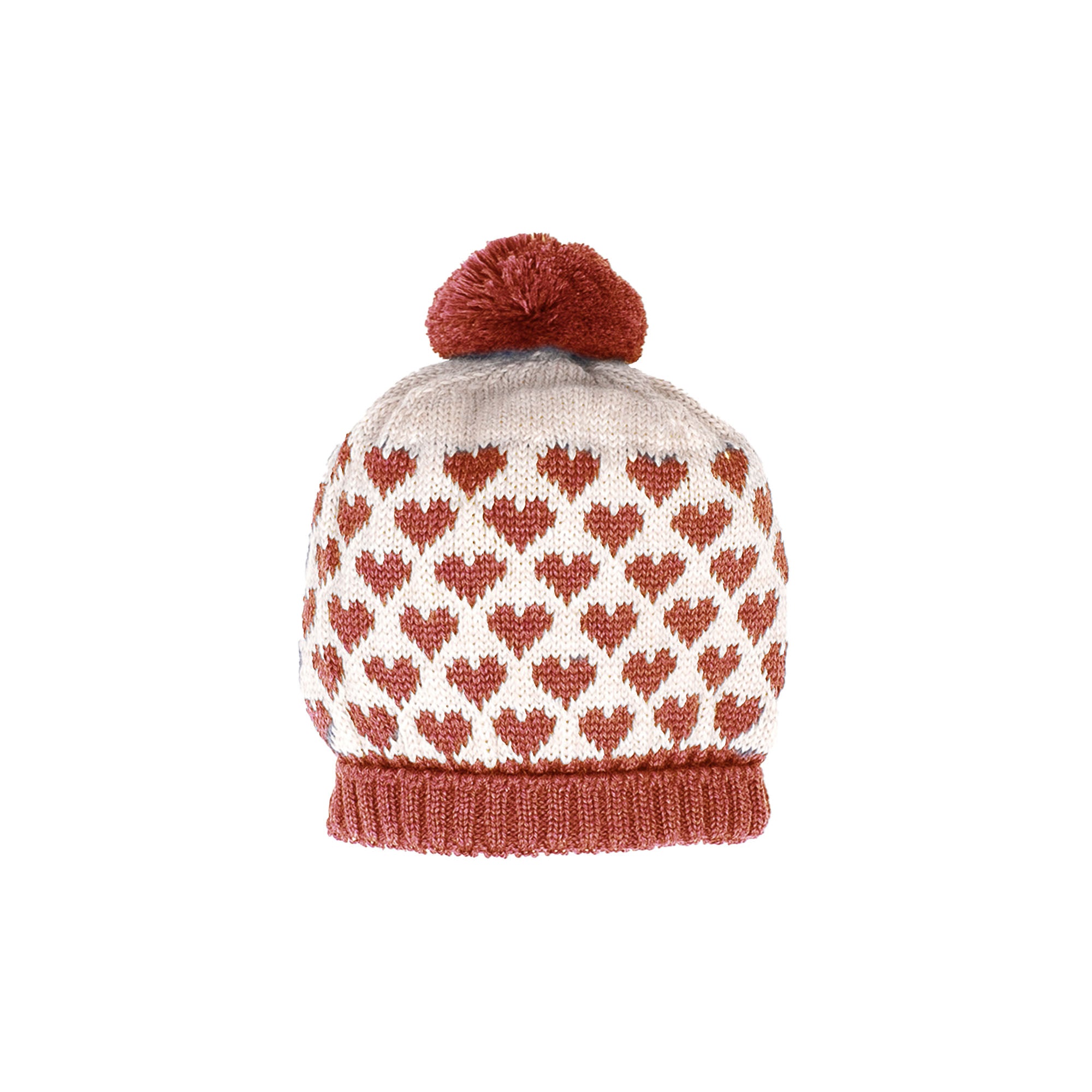 Bonnet motif cœurs en laine mérinos coloris rouge.